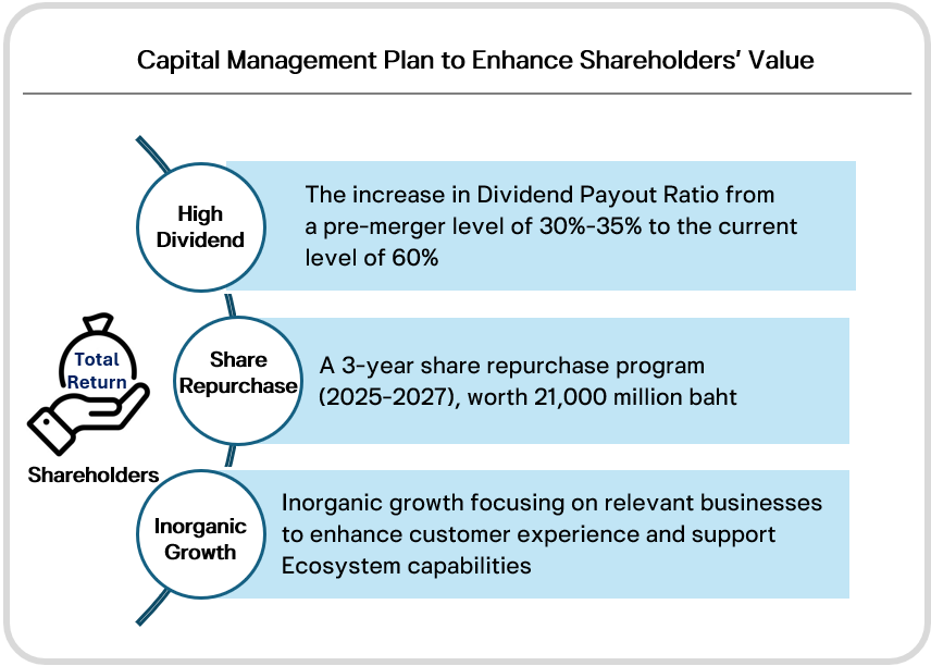 Meanwhile, the progress of the other two Capital Management initiatives has been on track. These included the three-year share repurchase program (2025-2027) with the total budget of 21,000 million baht. While the share repurchase is expected to enhance ROE over the long term, it can also help cushion shareholder value against capital market volatility. Additionally, in July, the Bank completed the acquisition of shares in Thanachart Securities as part of the inorganic growth initiative to enhance long-term potential and organizational value.