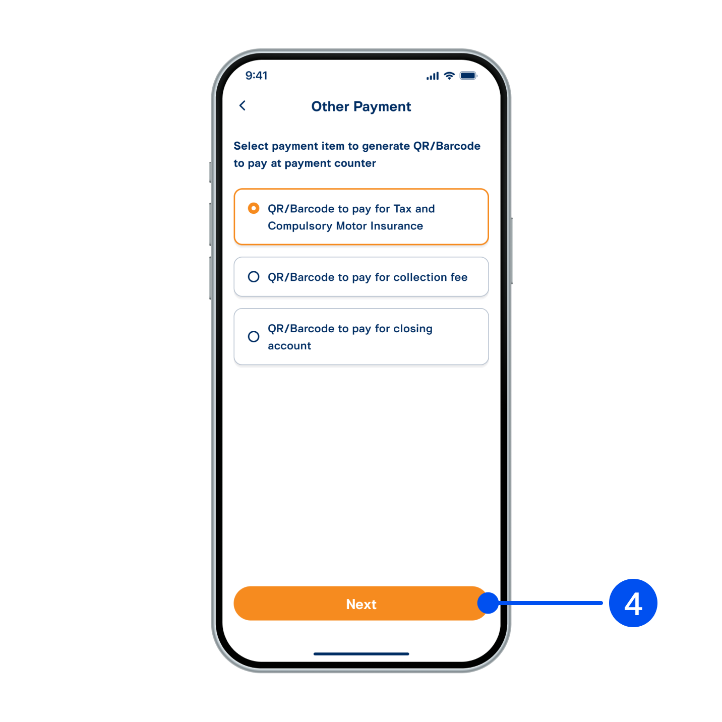 4. Select from 3 payments: Tax and Compulsory Motor Insurance, collection fee and closing account , then select “Next”.