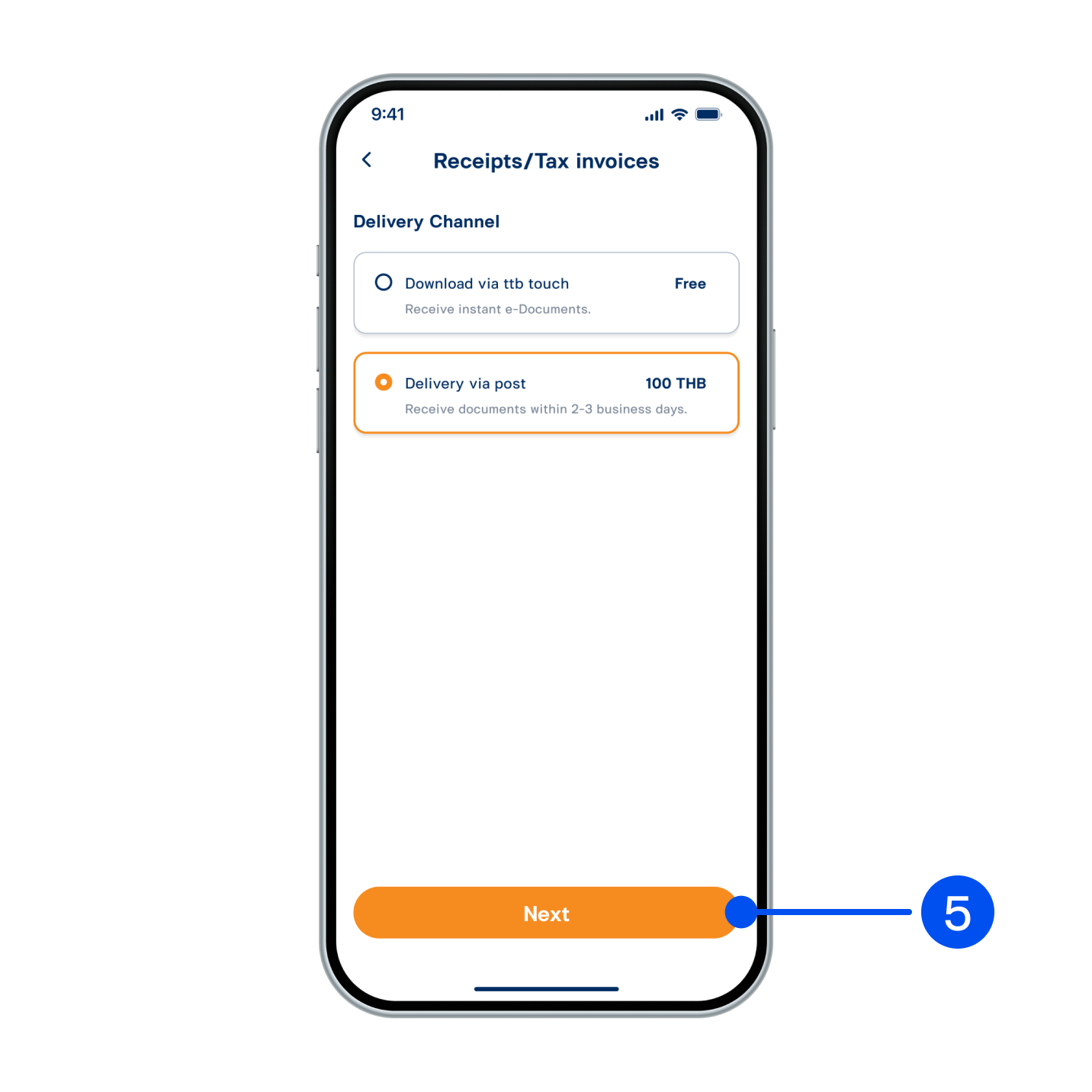 5. Select Delivery Channel, Download via ttb touch or Delivery via post, then select “Next”.