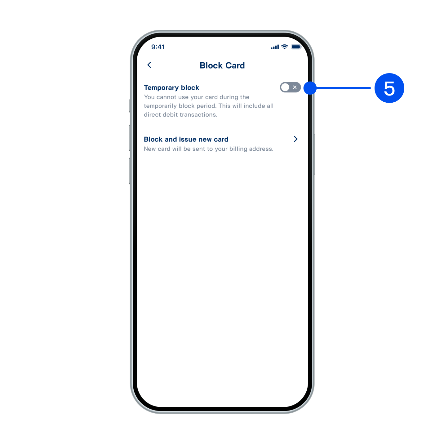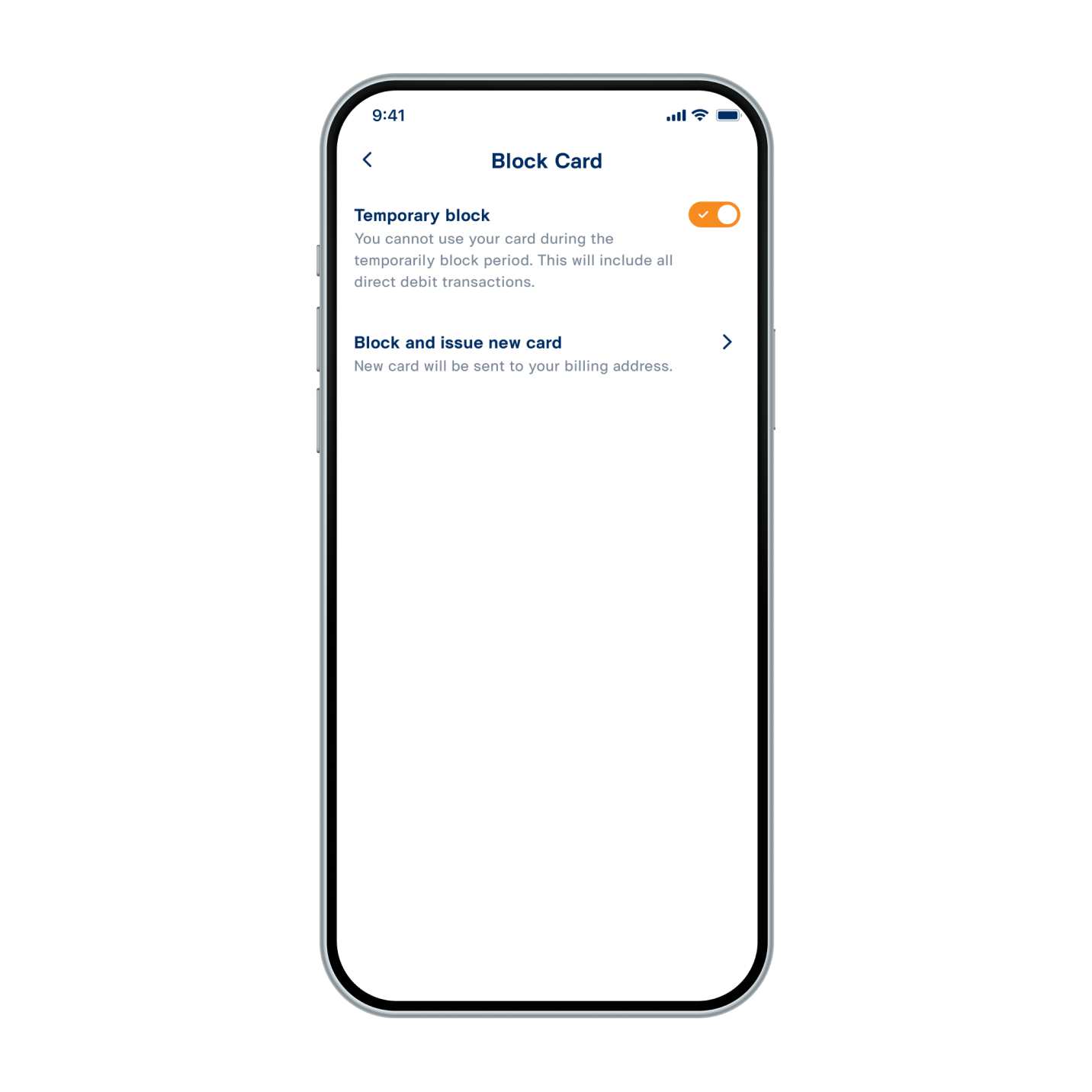 5. In “Temporary block”, toggle to orange check mark to block card.