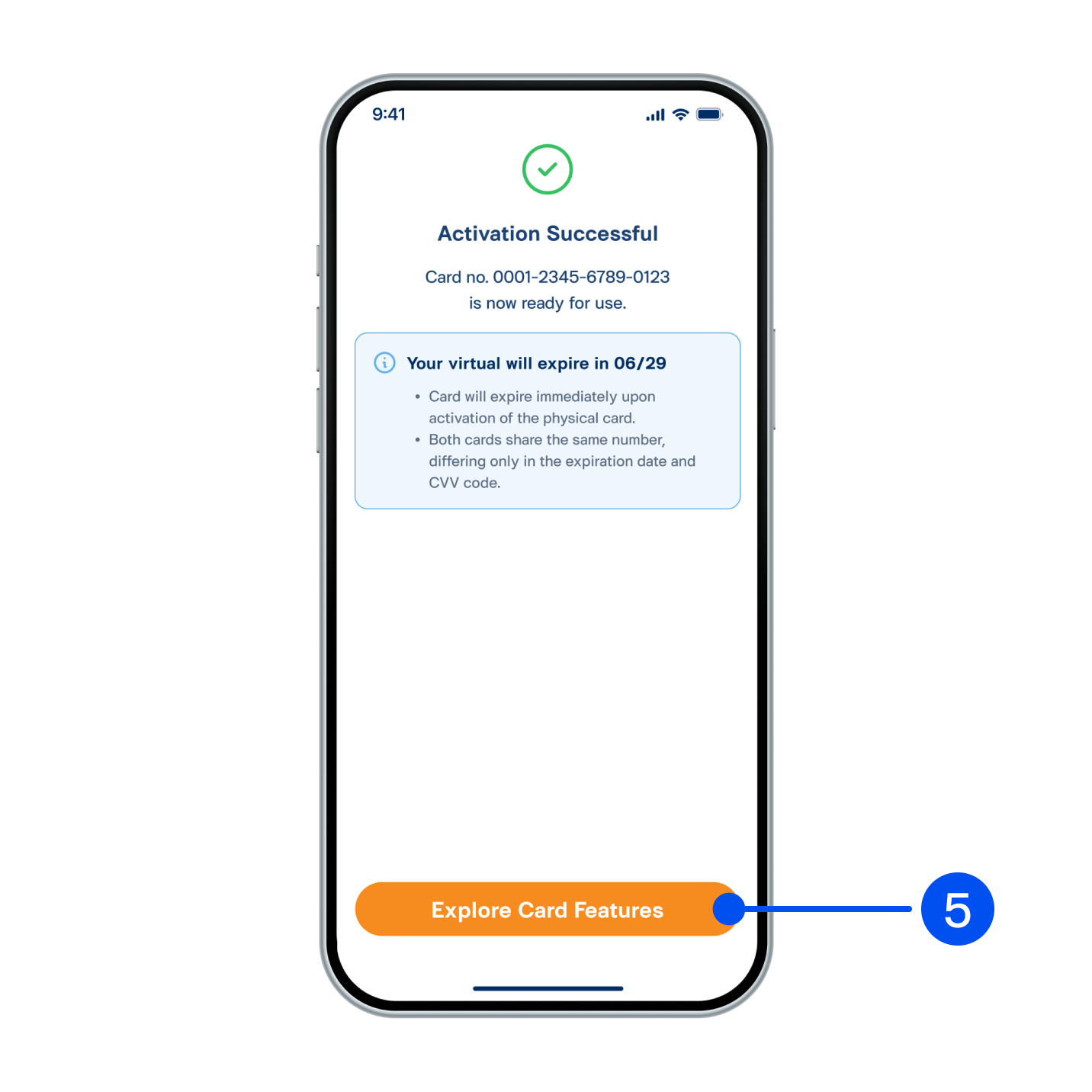 5. Card activated successfully. You may check card details by selecting "Explore card features".
