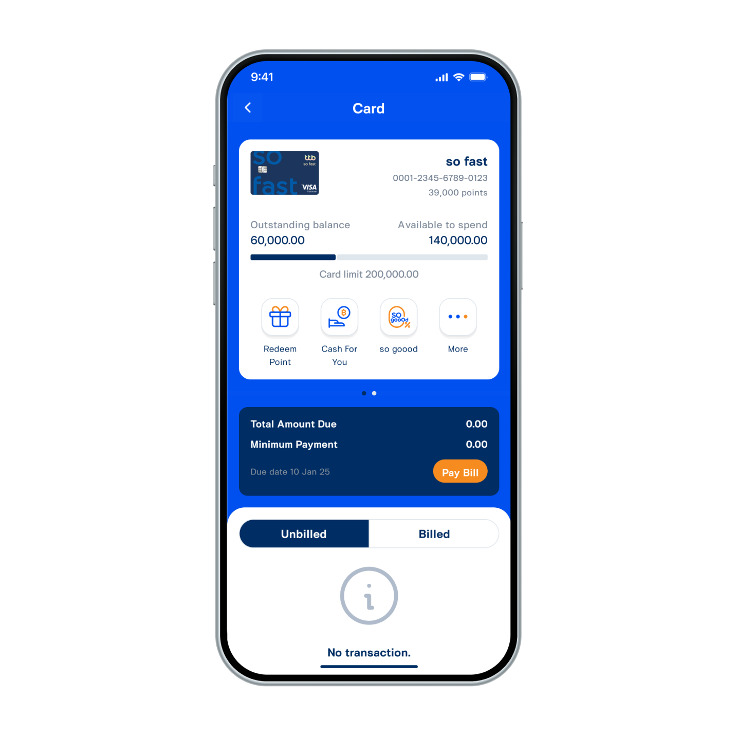 6. The system will display your card details, such as credit card no., outstanding balance, amount available to spend, and card limit.
