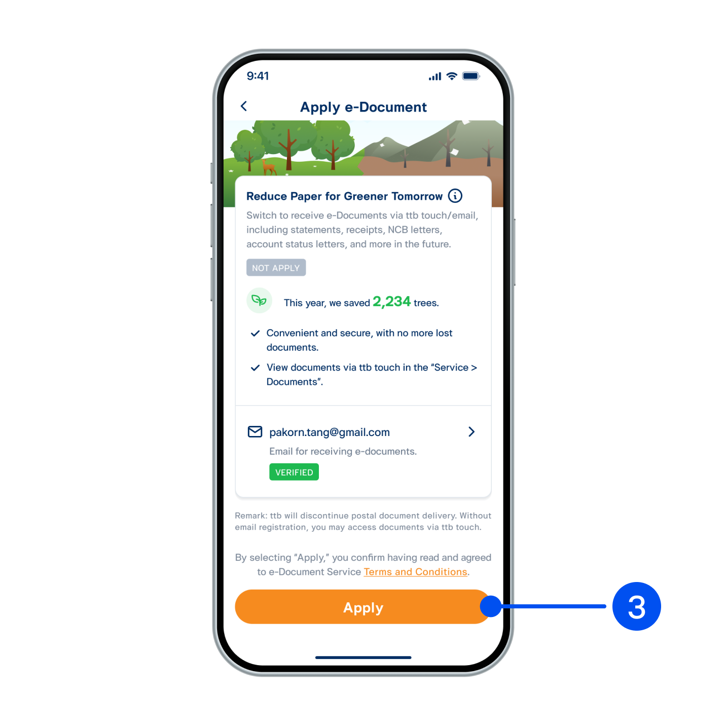 3. Read the service details and check your email address. Then, read the terms and conditions and select "Apply".