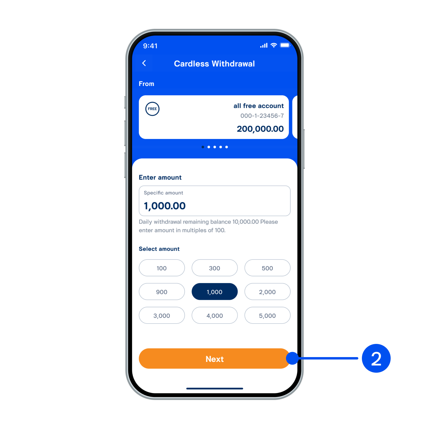 2. Slide left-right to select account. Enter Specific amount to withdraw, then select “Next”.