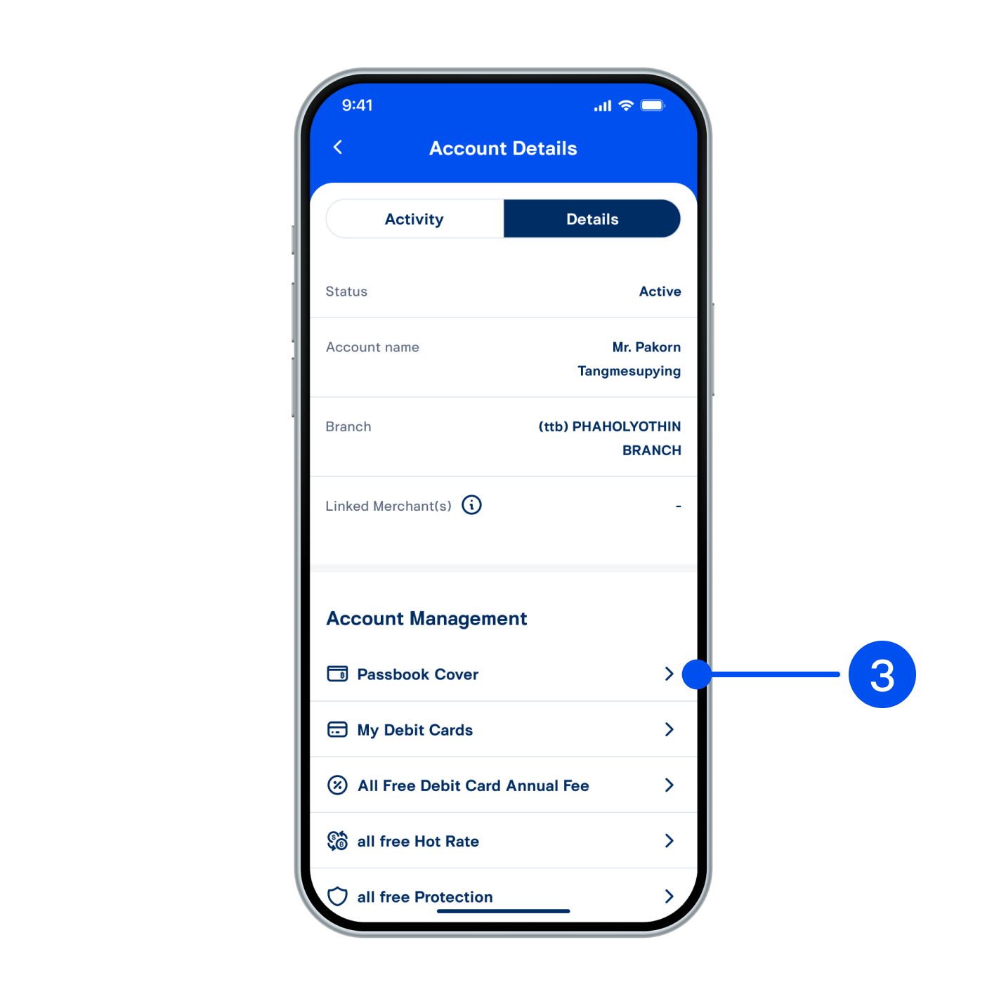 3. Select menu “Details”. In Account Management, select “Passbook Cover”.