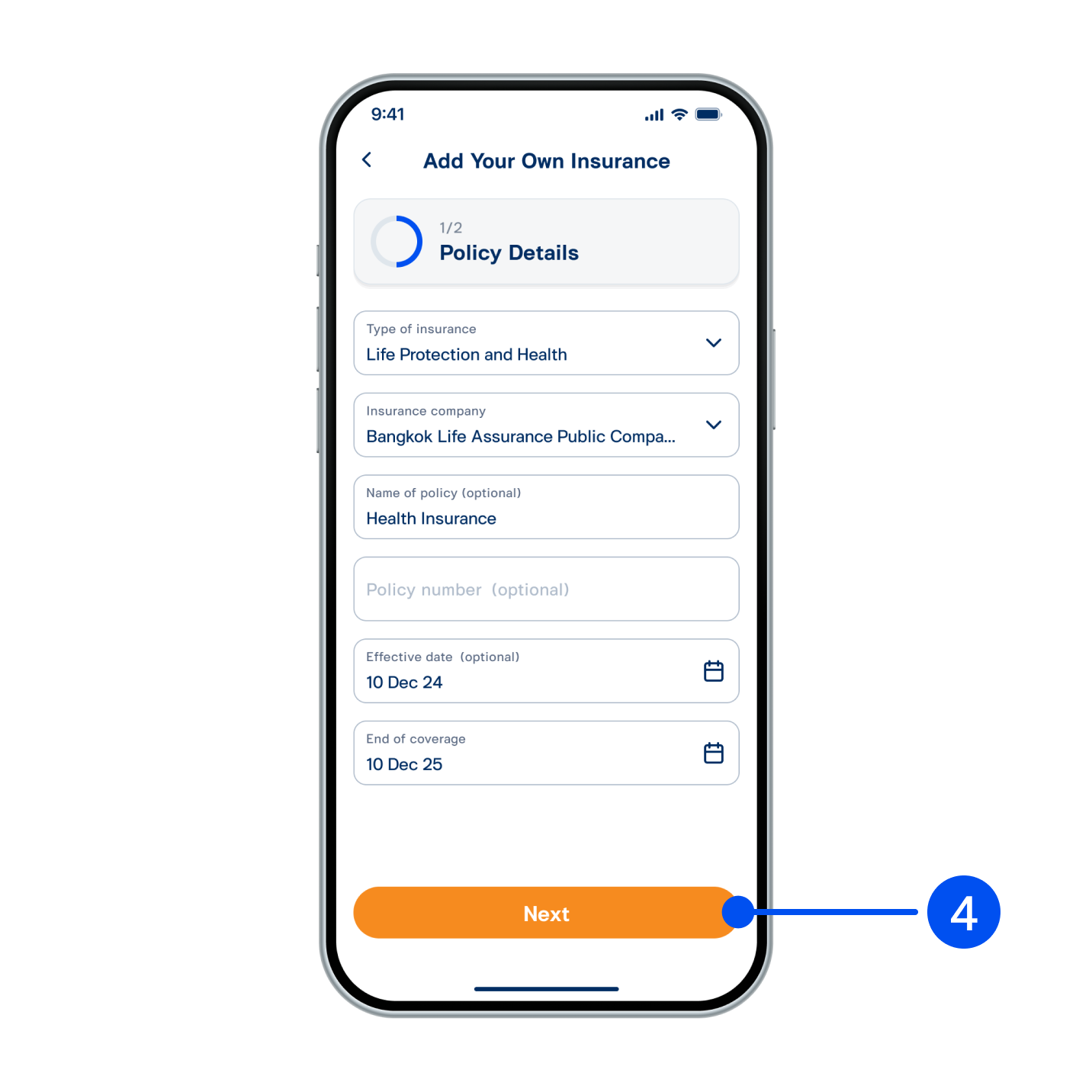 4. Select type of insurance, insurance company, enter name and number of policy, select effective date and end of coverage, then select “Next”.
