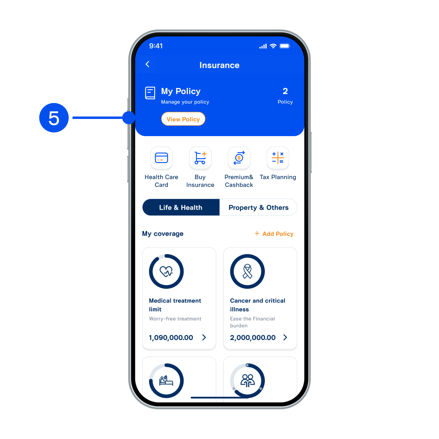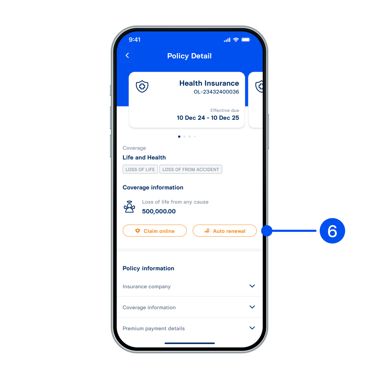 6. View policy, claim online or auto renewal from this page.