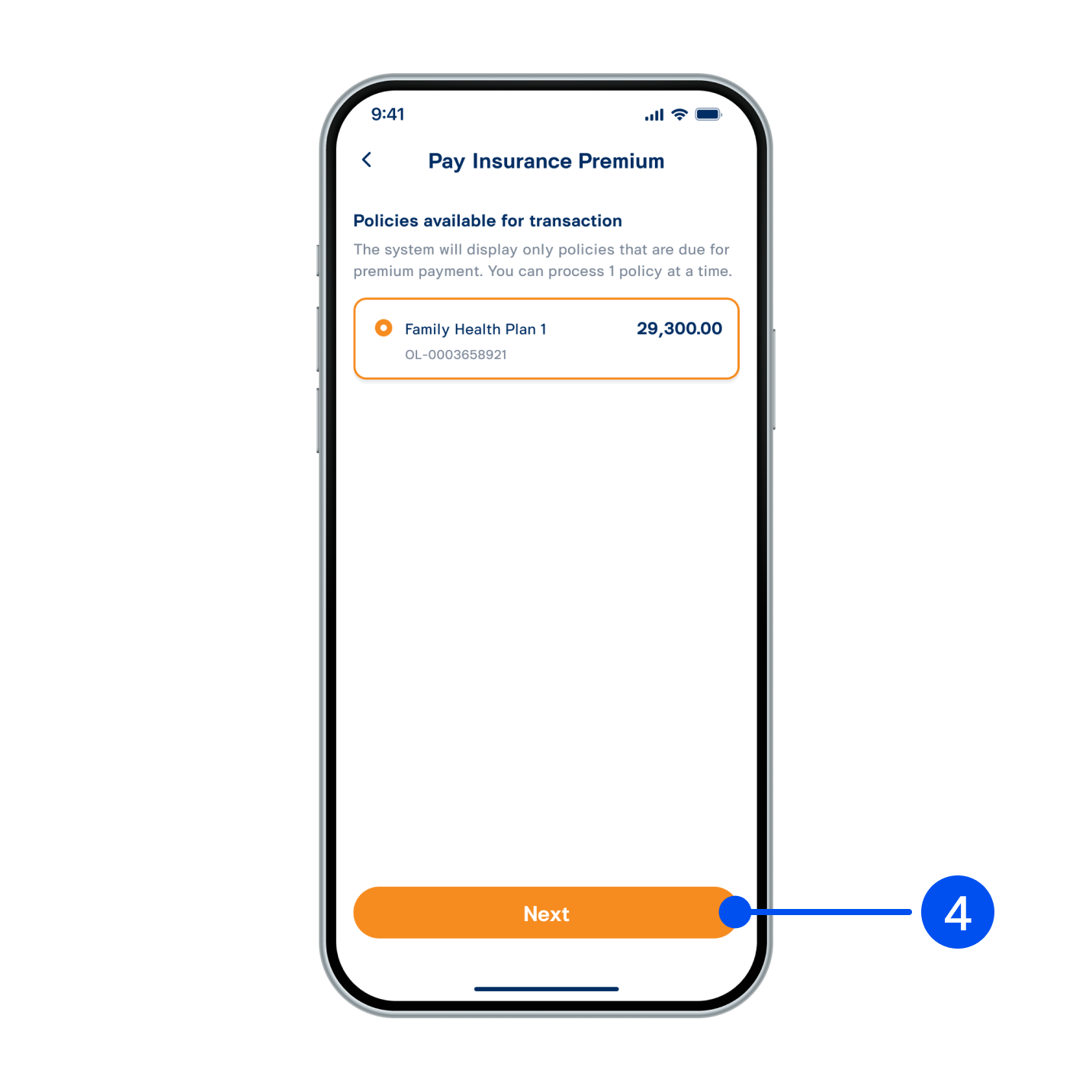 4. Select policy to proceed with payment, then select “Next”.