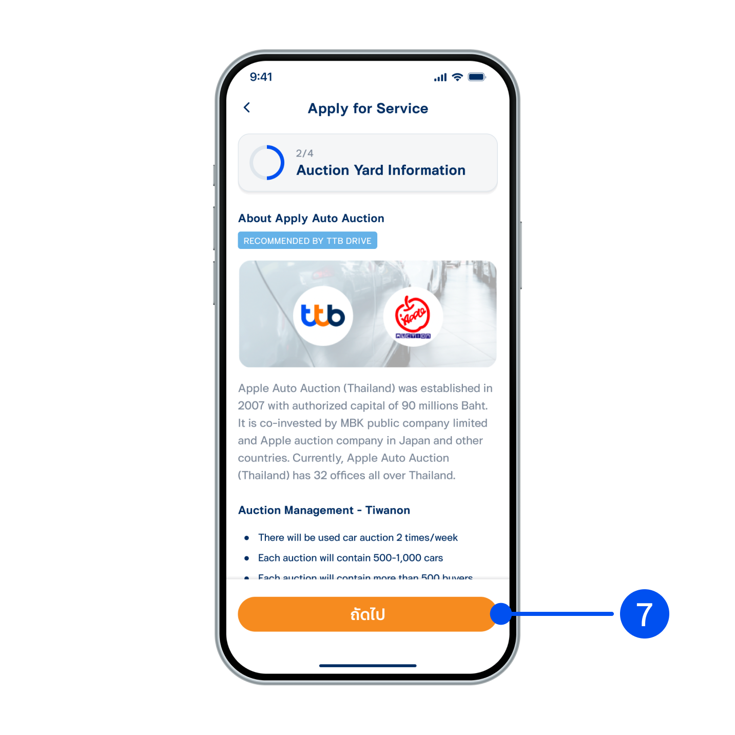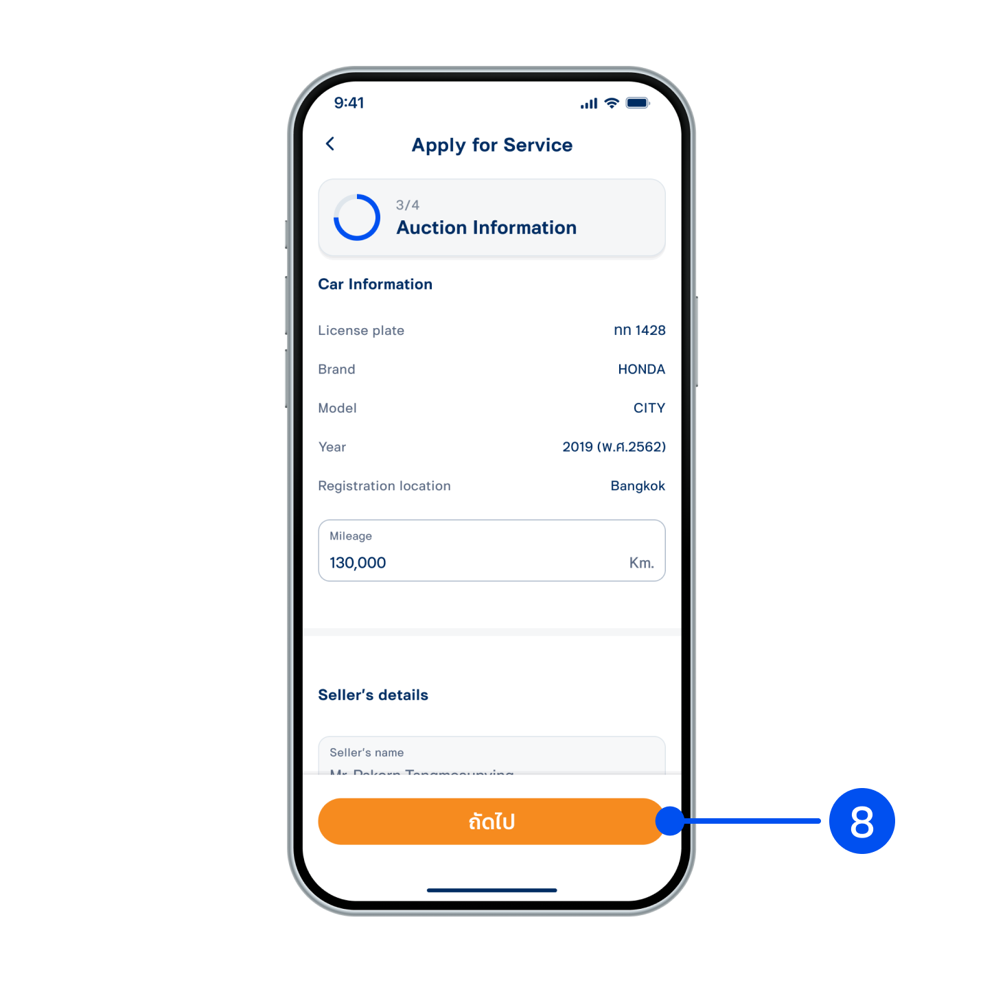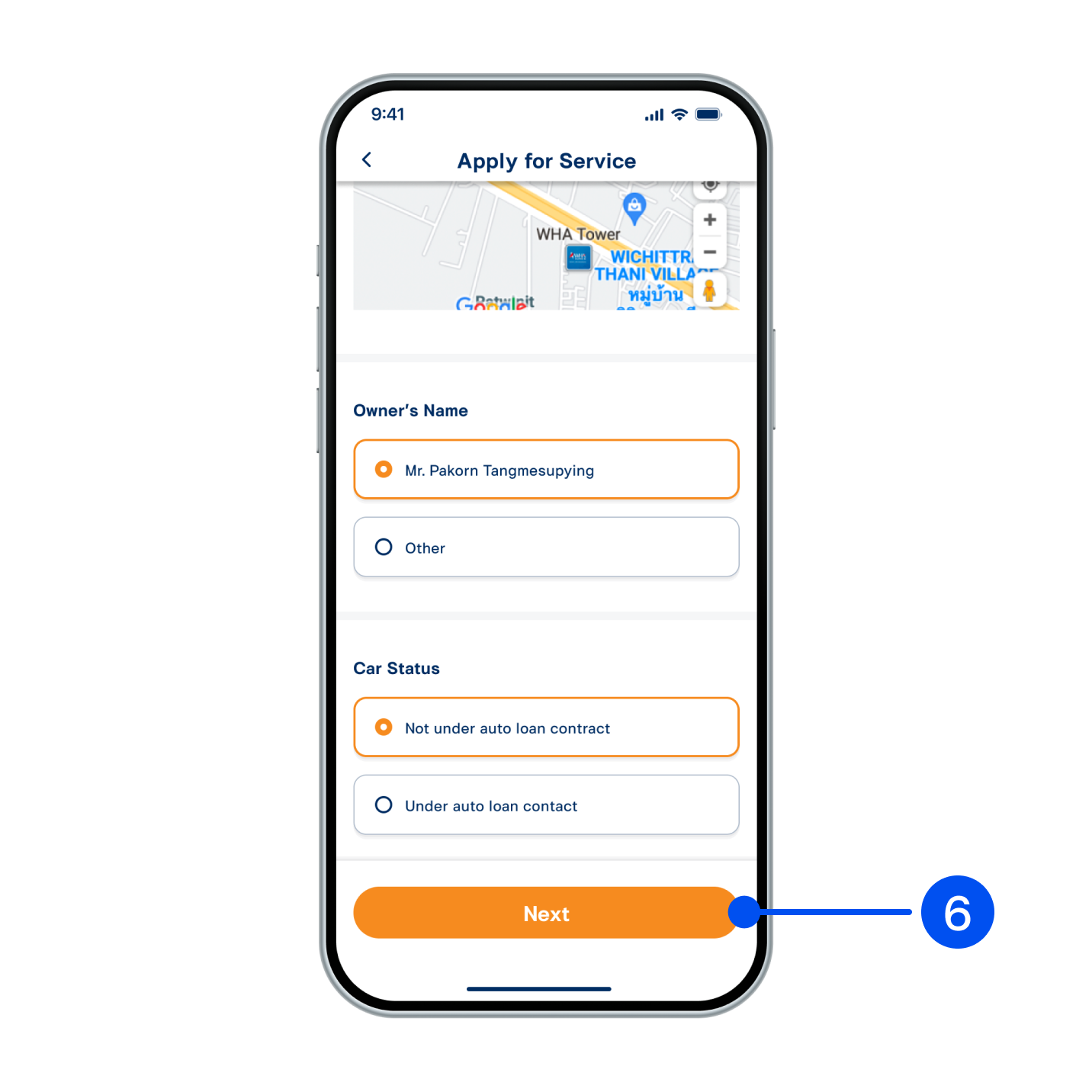 6. Enter car information which are Preferred meeting location, Owner’s Name and Car Status, then select “Next”.