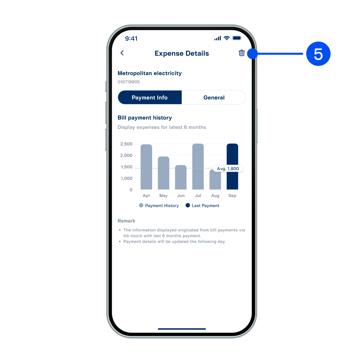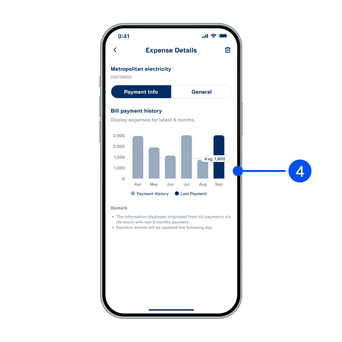 4. Expense details screen displays two sections: “Payment Info” and “General”