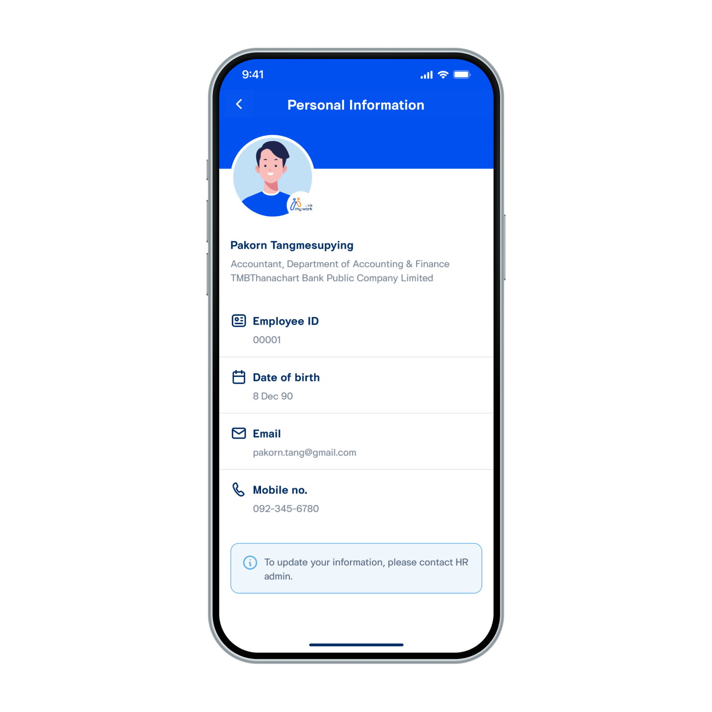 4. The system will display personal information consists of Employee ID, Date of birth, Email, and Mobile no.