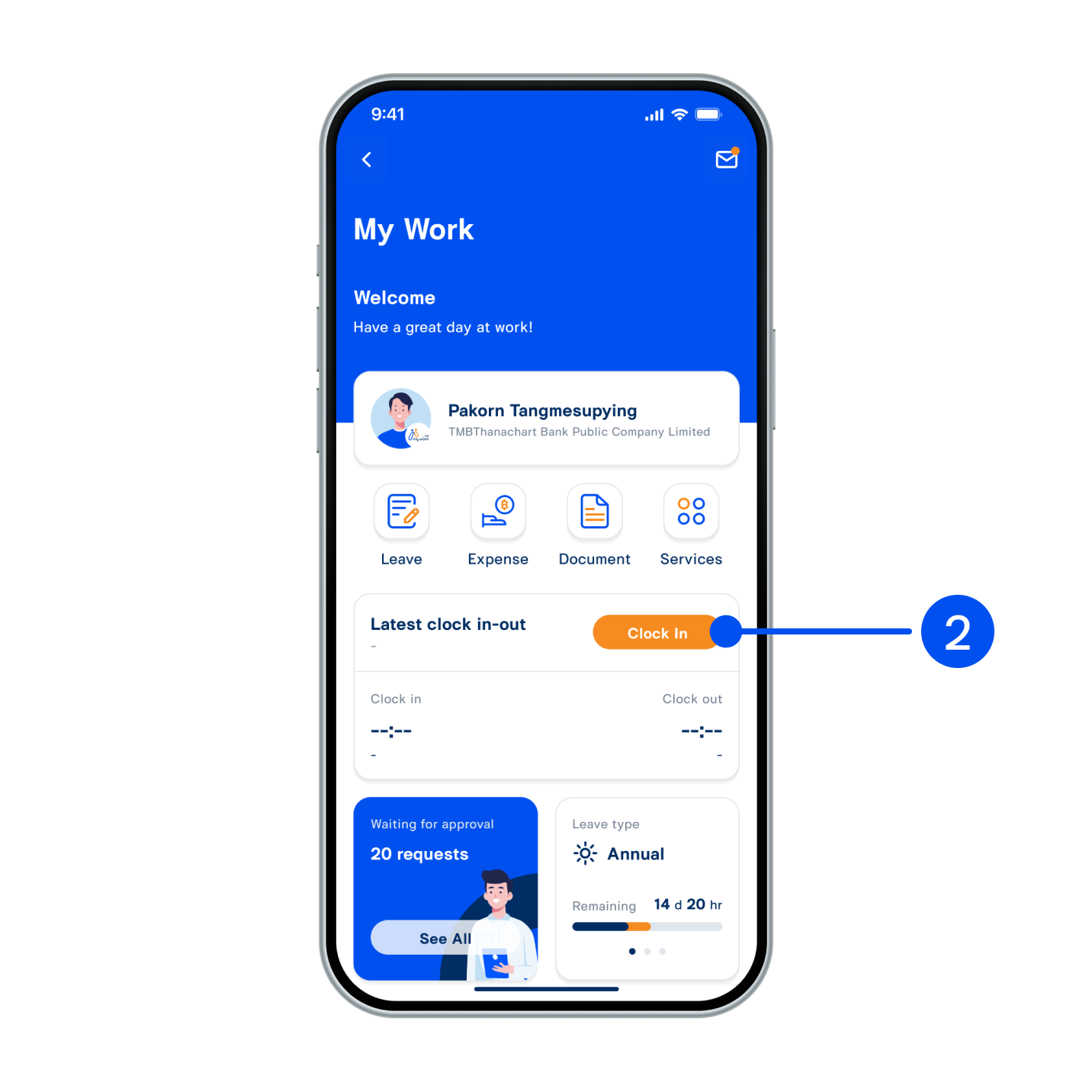 2. In Latest clock in-out, select “Clock In”. For first-time usage, please grant the permission to access location.