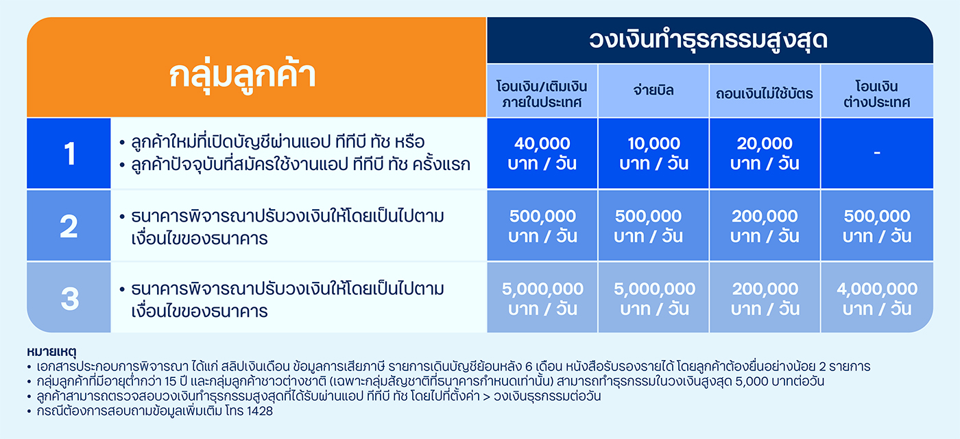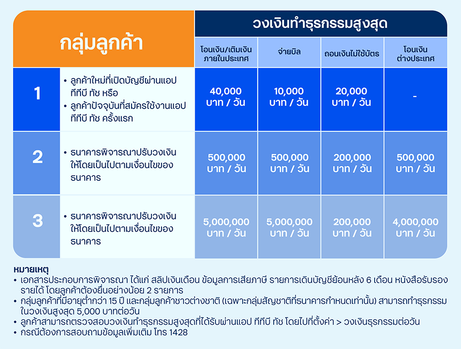 ตั้งแต่วันที่ 9 กันยายน 2568 สำหรับลูกค้าใหม่ที่เปิดบัญชีผ่านแอป ทีทีบี ทัช และลูกค้าปัจจุบันที่สมัครใช้งานแอป ทีทีบี ทัช ครั้งแรก ธนาคารจะกำหนดวงเงินการโอนเงินหรือชำระเงิน ให้เหมาะสมกับการใช้งาน และจะเริ่มทยอยกำหนดวงเงินโอนเงินหรือชำระเงิน ให้เหมาะสมกับการใช้งานของลูกค้าปัจจุบันแต่ละกลุ่ม ตามรายละเอียดด้านล่าง