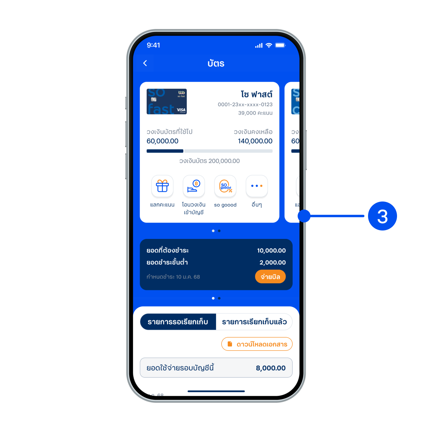 2. เลือกแถบ “บัตร” ด้านบน จากนั้นเลือกบัตรที่ต้องการดูยอดใช้จ่ายและวงเงินบัตร