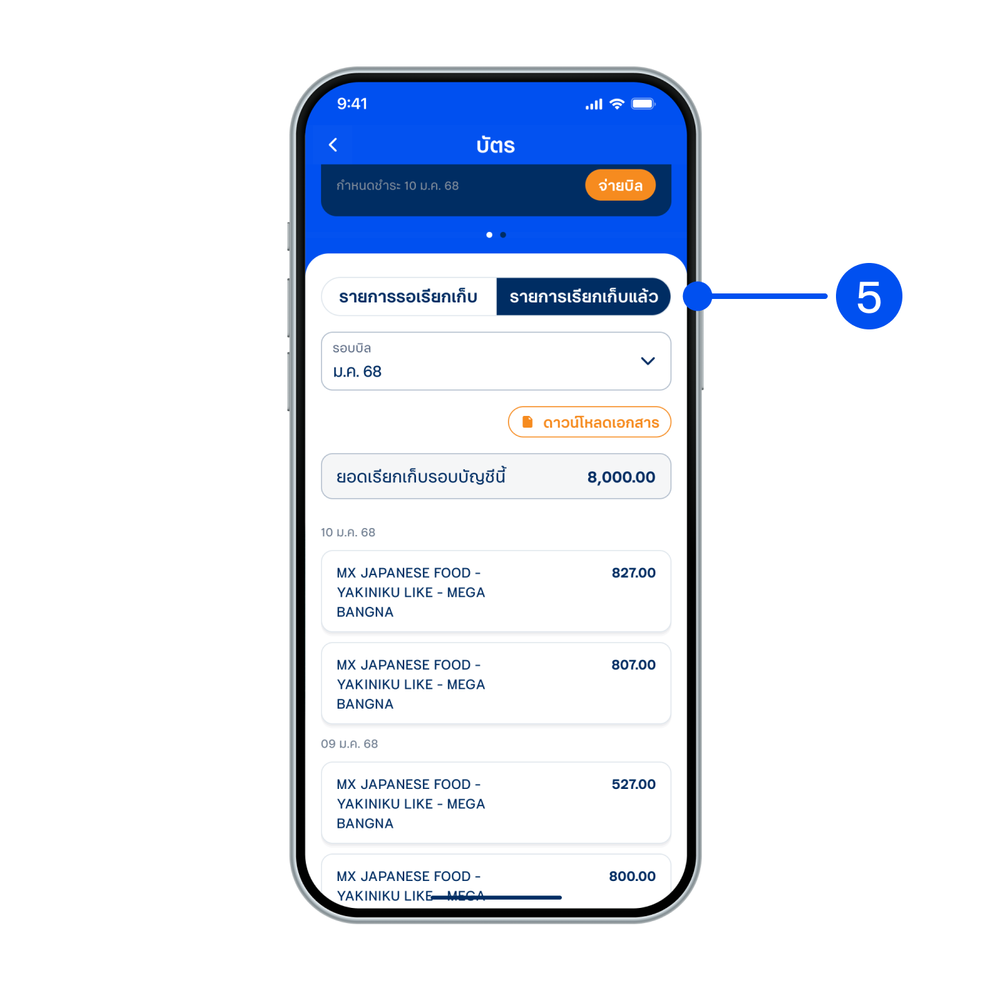 5. เลือกแถบ “รายการเรียกเก็บแล้ว” เพื่อดูรายละเอียดและยอดเรียกเก็บรอบบัญชีนี้