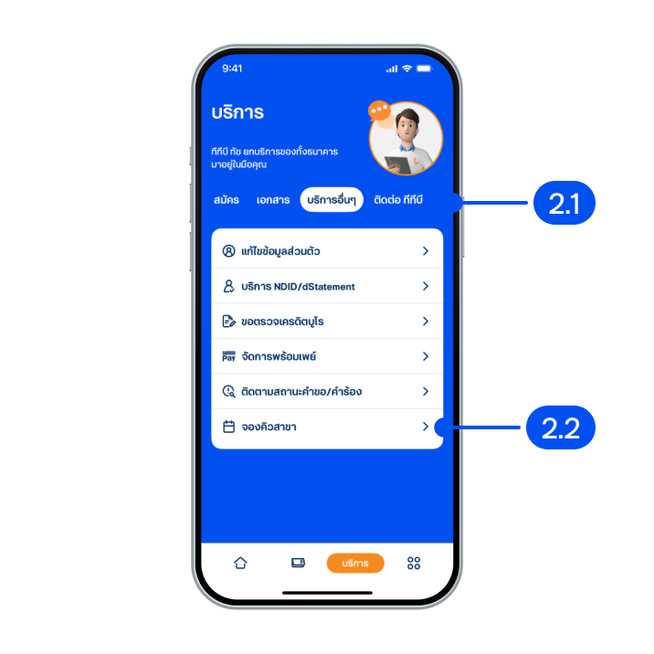 1. เลือกเมนู “บริการ” ลำดับที่ 3 ของเมนูด้านล่าง