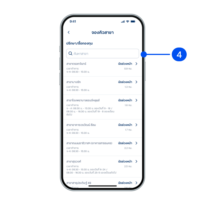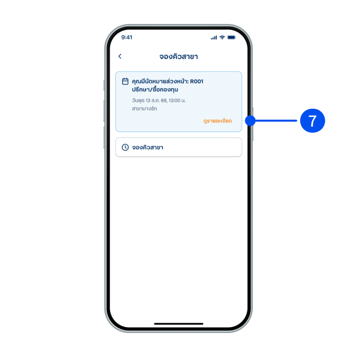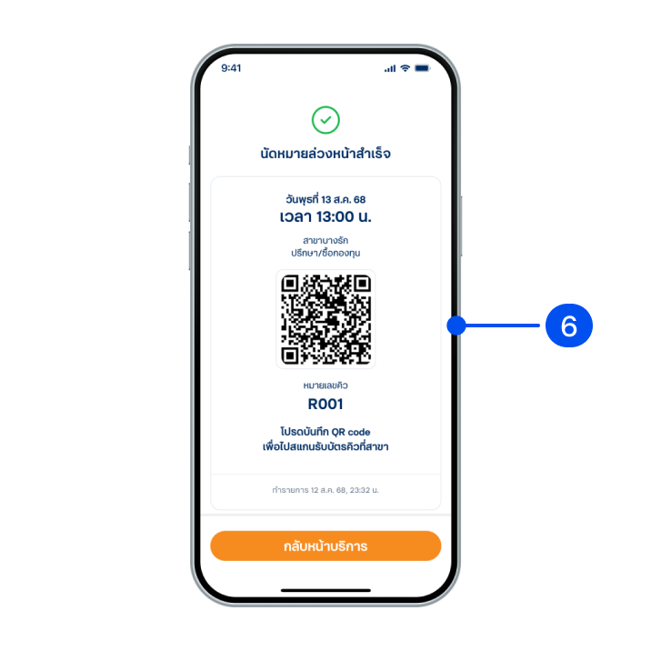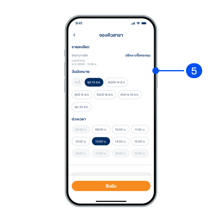 5. จองคิวทันที (ได้ทุกธุรกรรม) หรือเลือกเวลาเพื่อนัดหมายล่วงหน้า (เฉพาะธุรกรรม เช่น ปรึกษา/ซื้อกองทุน และสินเชื่อต่าง ๆ)