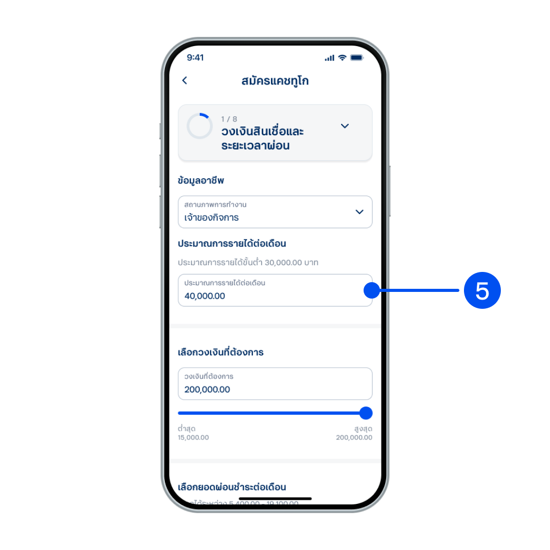 5. ใส่ข้อมูลอาชีพ เลือกวงเงินที่ต้องการ และยอดผ่อนชำระต่อเดือน จากนั้นเลือก “ถัดไป”