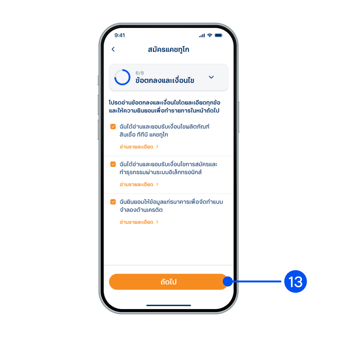 13. เลือกยอมรับข้อตกลงและเงื่อนไข จากนั้นเลือก “ถัดไป”