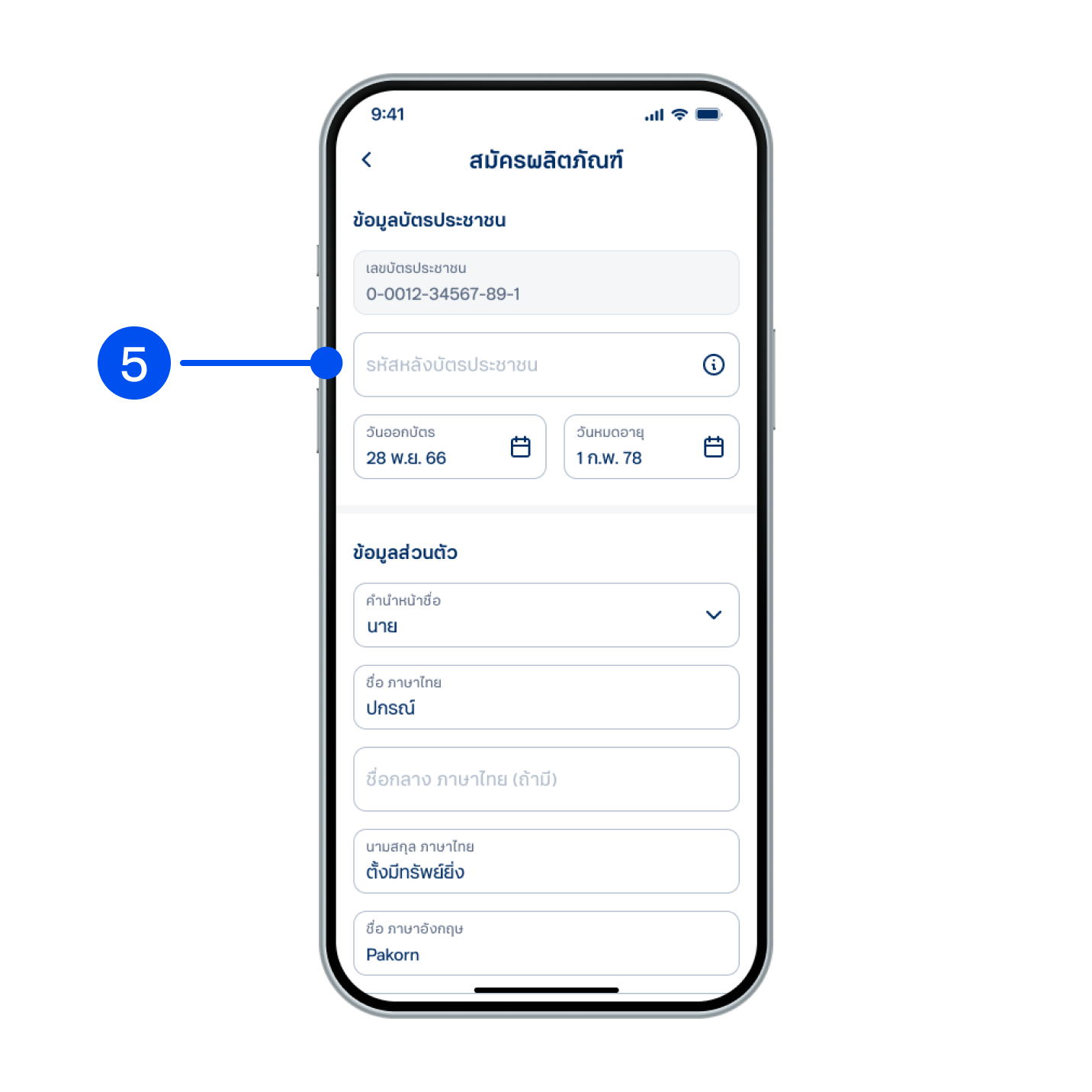 5. ใส่รหัสหลังบัตรประชาชน จากนั้นเลื่อนลงเพื่อเลือก “ถัดไป”