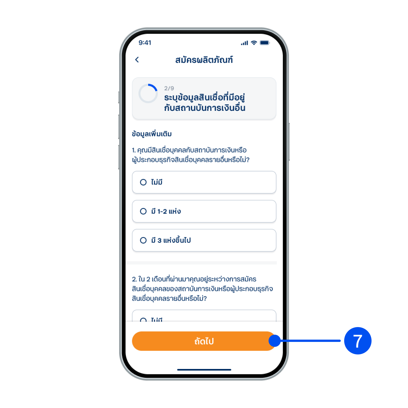 7. ตอบคำถามเกี่ยวกับสินเชื่อที่มีอยู่กับสถาบันการเงินอื่น จากนั้นเลือก “ถัดไป”