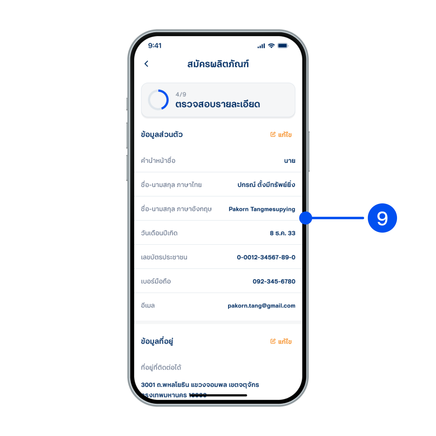 9. ตรวจสอบรายละเอียดข้อมูลส่วนตัว และข้อมูลที่อยู่ จากนั้นเลือก “ถัดไป”