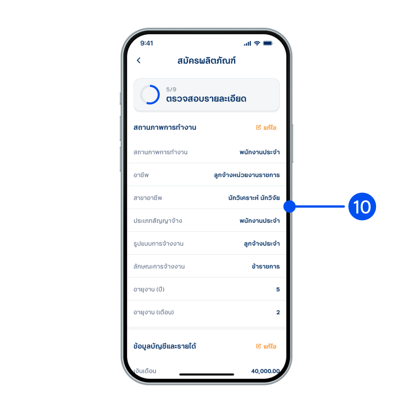 10. ตรวจสอบรายละเอียดสถานภาพการทำงาน ข้อมูลบัญชีและรายได้ สถานที่ทำงานและอีเมลจัดส่งเอกสารจากนั้นเลือก “ถัดไป”