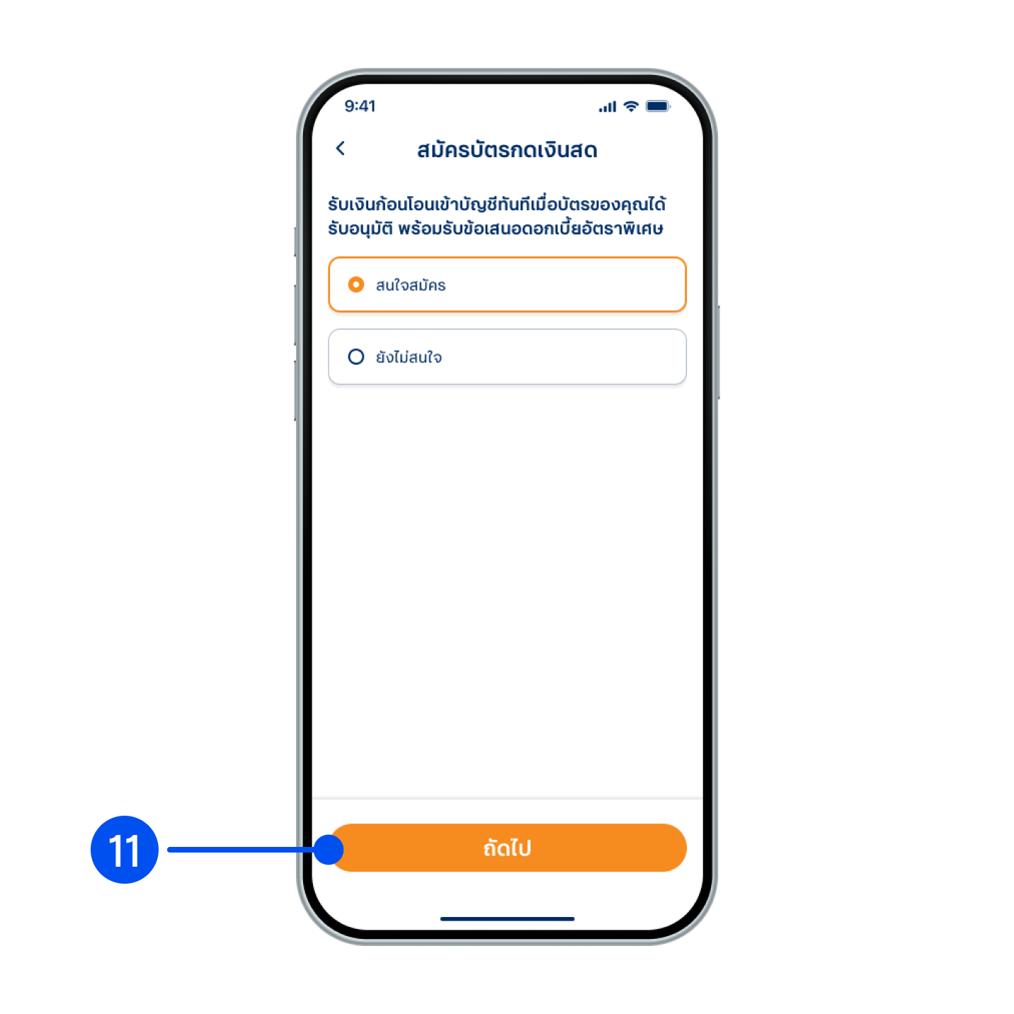 11. อ่านรายละเอียดเกี่ยวกับบริการ เลือก "สนใจสมัคร" หรือ "ยังไม่สนใจ" ตามความต้องการของคุณ จากนั้นเลือก "ถัดไป"