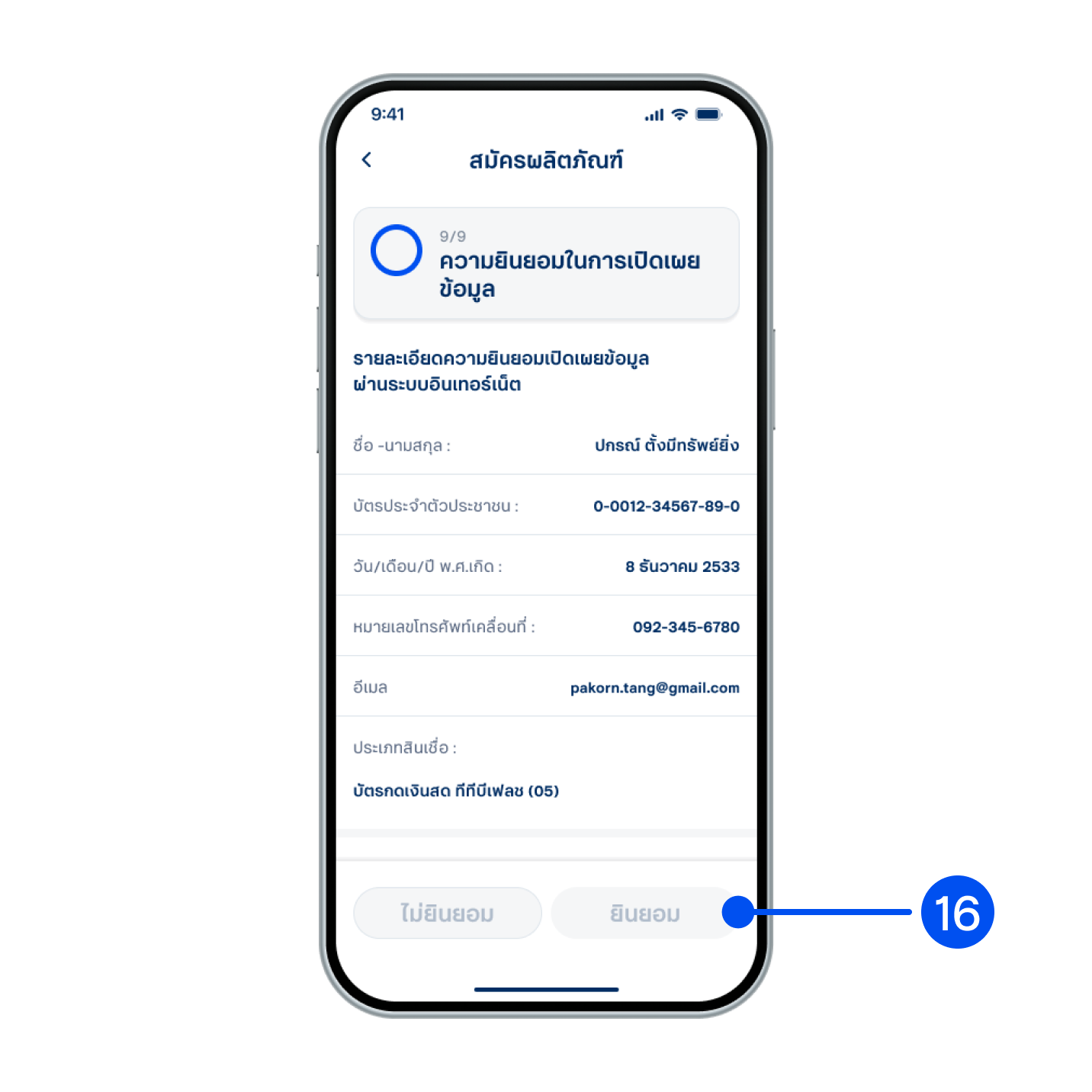 16. อ่านรายละเอียดความยินยอมใน การเปิดเผยข้อมูล จากนั้นเลือก “ยินยอม”