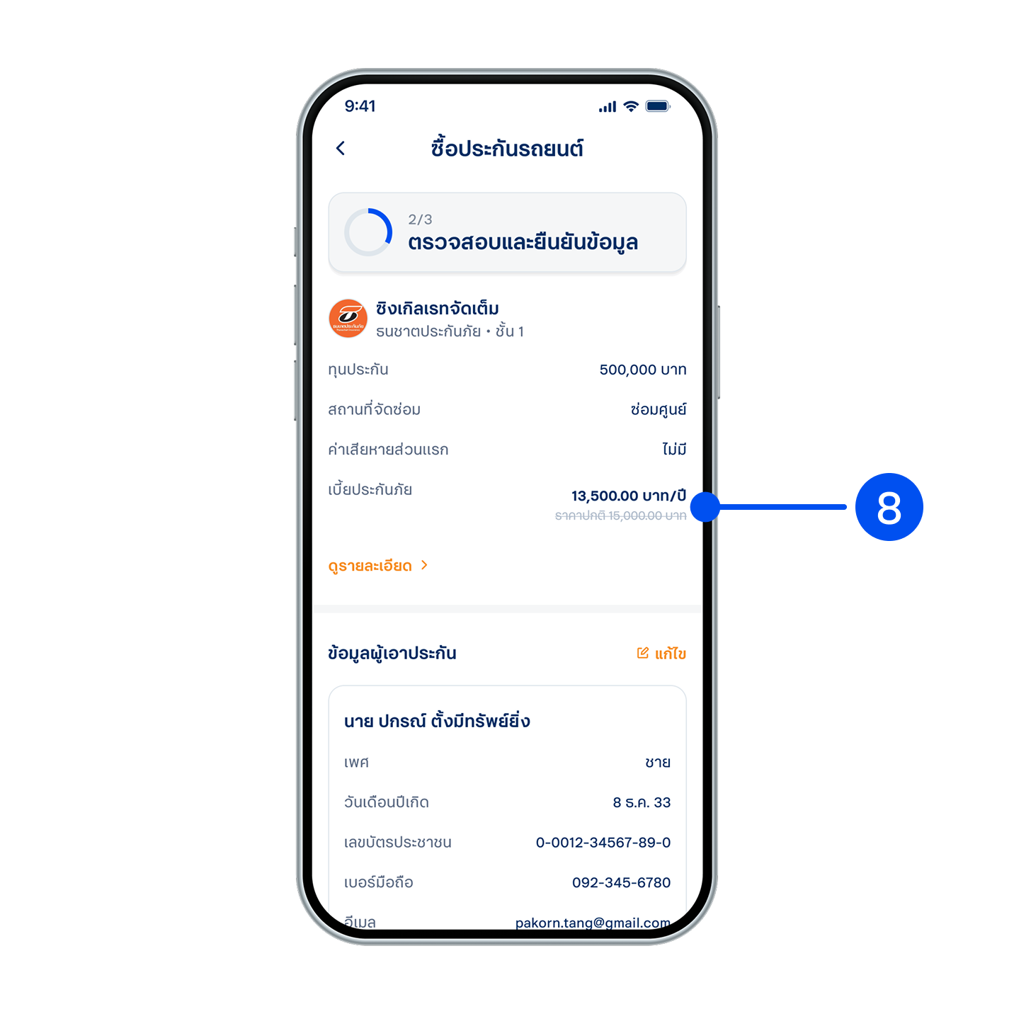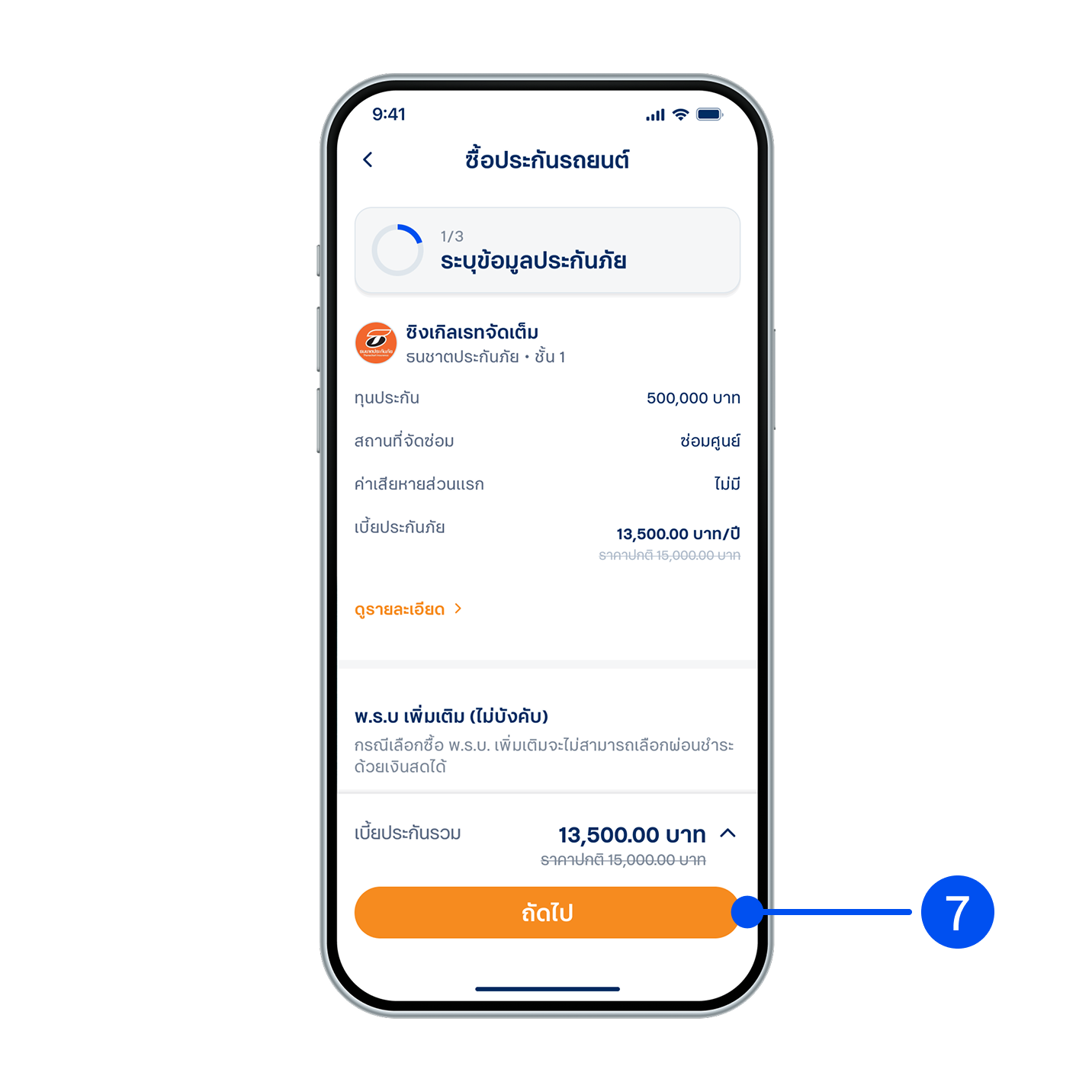 7. ใส่ข้อมูลสำหรับการซื้อประกันให้ครบถ้วน จากนั้นเลือก “ถัดไป”