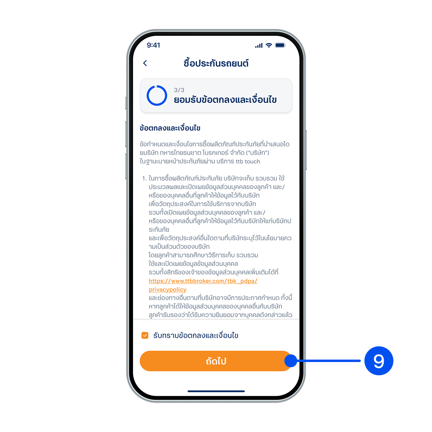 9. อ่านข้อตกลงและเงื่อนไข จากนั้นเลือก “รับทราบข้อตกลงและเงื่อนไข” และกด “ถัดไป”