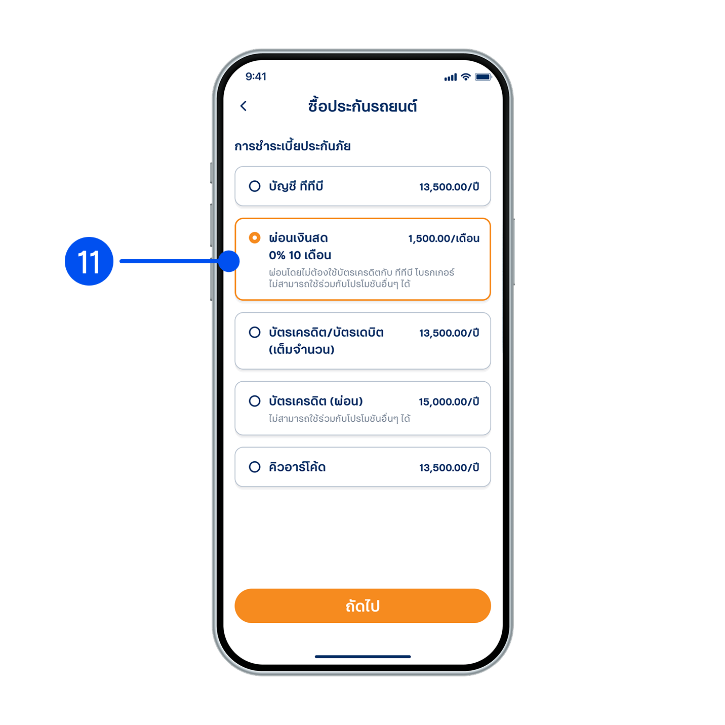 11. เลือกวิธิการชำระเบี้ยประกันภัย จากนั้นกด “ถัดไป” เพื่อเข้าสู่ขั้นตอนการชำระเงิน