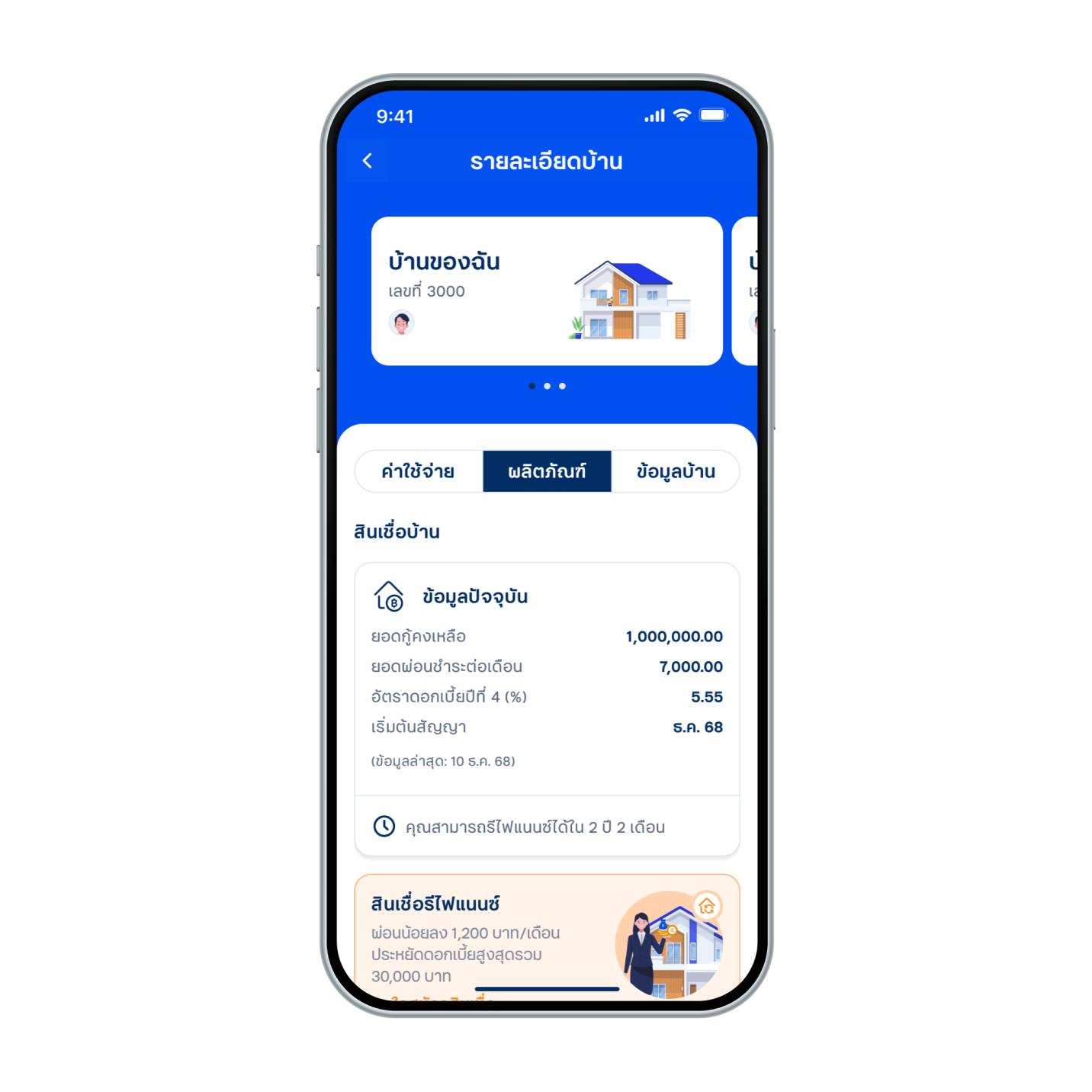 6. ระบบจะพากลับมาที่หน้าผลิตภัณฑ์ โดยมีการแสดงข้อมูลสินเชื่อที่ใส่ไว้ พร้อมแสดงข้อเสนอการรีไฟแนนซ์