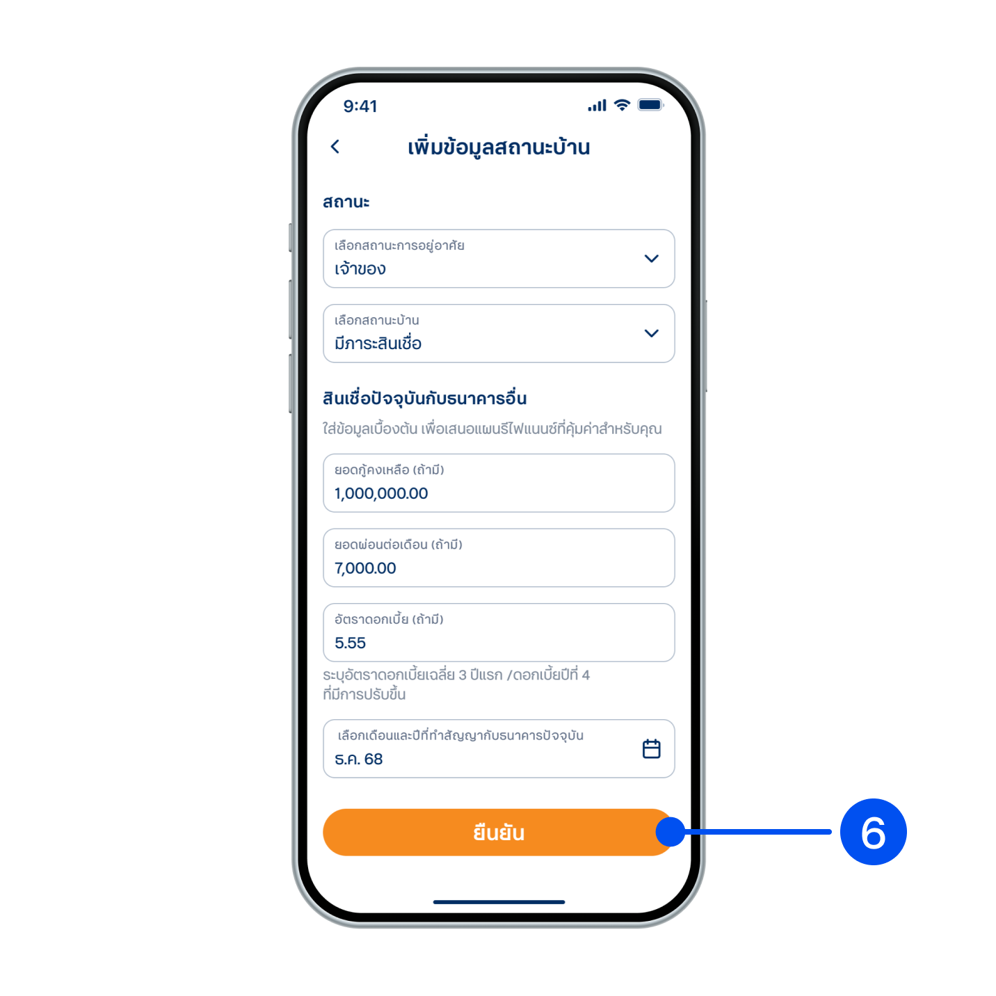 6. ใส่ข้อมูลสินเชื่อปัจจุบันกับธนาคารอื่น จากนั้นเลือก “ยืนยัน”